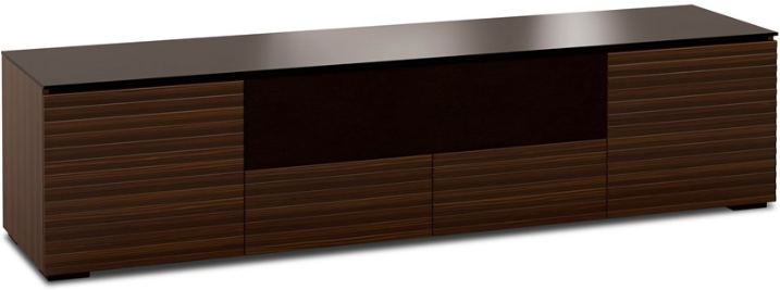 This sleek, streamlined design features a horizontal pattern on opium brown wood with a black glass top and wood block feet. Features Infinitely adjustable, black interior shelves. Built-in ventilation louvers for better air flow keep equipment cool.