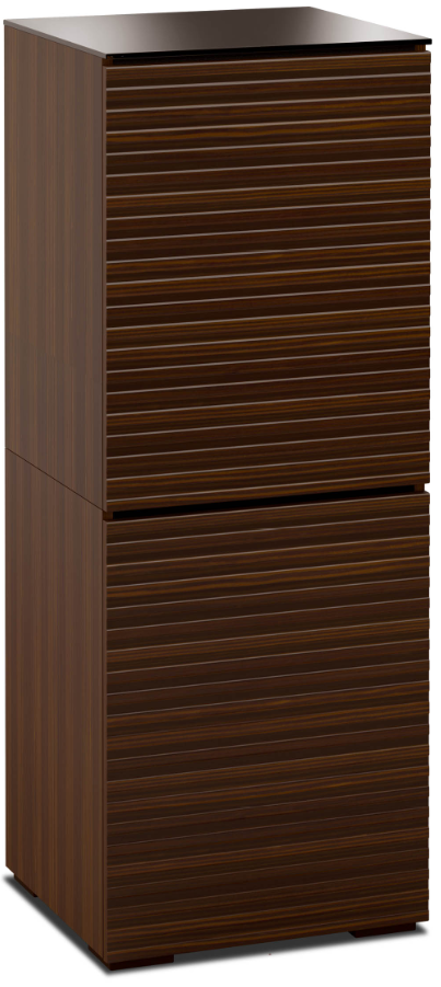This sleek, streamlined design features a horizontal pattern on opium brown wood with a black glass top and wood block feet. Features Infinitely adjustable, black interior shelves. Built-in ventilation louvers for better air flow keep equipment cool.