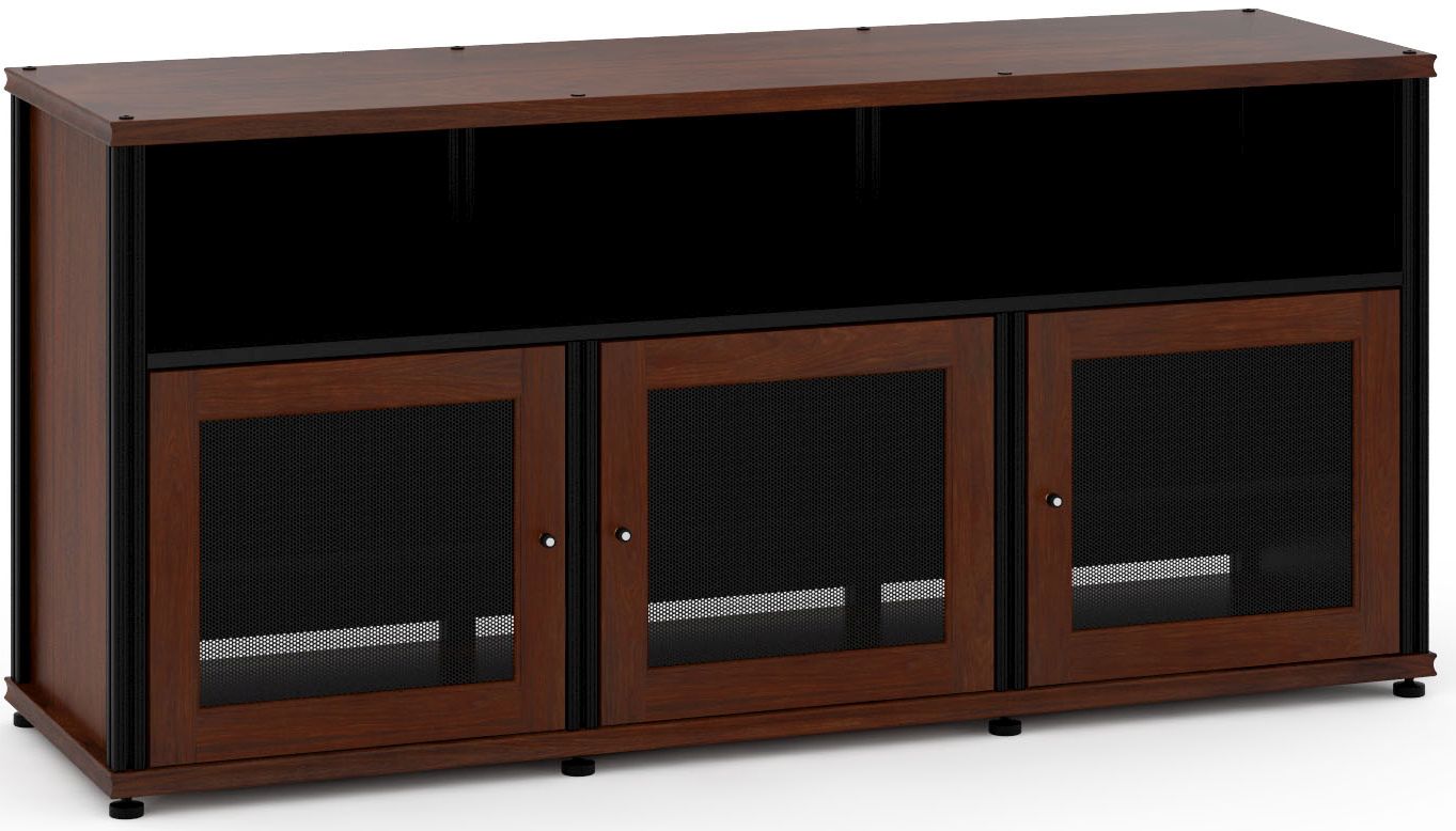 Salamander Designs® Synergy Model 339 AV Cabinet-Dark Walnut/Black with perforated door panels and an open upper sectionRead More